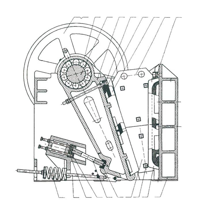 Supporting the movement of the jaw teeth is an eccentric shaft, which runs through the machine frame. The eccentric motion is usually generated by flywheels fixed at both ends of the shaft. Spherical roller bearings are often used for the flywheels and eccentric support bearings, and these bearings must withstand huge impact loads, abrasive sewage, and high temperatures.