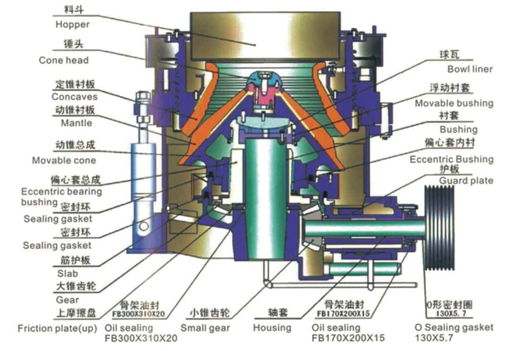 - The cone crusher is fitted with inner and outer copper bushings, one steel ball seat, and one ball copper. The dust seal ring in the ball seat is floated up by a spring, which enables adjustment during the crusher’s operation.